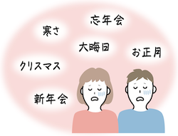 冬の寒さは、活動時や緊張時に働く交感神経を刺激します。冬は、忘年会、クリスマス、大晦日、お正月、新年会と行事も目白押し。ますます交感神経が刺激され体はいつも緊張状態。休息時に働く副交感神経が作動する暇はなく、疲労、だるさ、頭痛、イライラ、筋肉のコリがつのります。これが冬バテ。